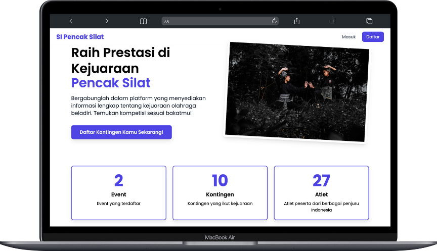 Sistem Event Pencak Silat yang dikembangkan untuk mengelola pendaftaran peserta secara online melalui landing page informatif, dilengkapi verifikasi otomatis dan fitur ekspor data ke Excel untuk mempermudah pelaporan.