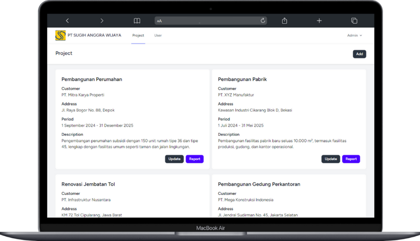 Daily Report System yang dikembangkan untuk memantau aktivitas proyek secara efisien melalui fitur pencatatan harian, manajemen material, serta pelaporan otomatis dalam satu platform kolaboratif multi-user.