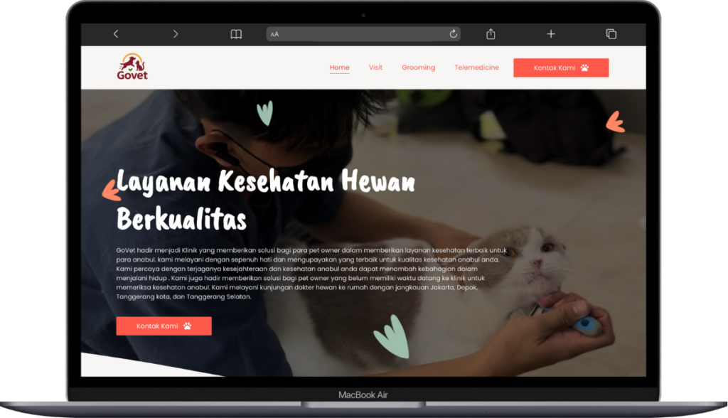 Govet menghadirkan layanan dokter hewan panggilan (home visit) profesional di Jakarta melalui website company profile yang dirancang untuk memudahkan pemilik hewan mengakses informasi, memahami prosedur, serta melakukan pemesanan secara cepat dan praktis.