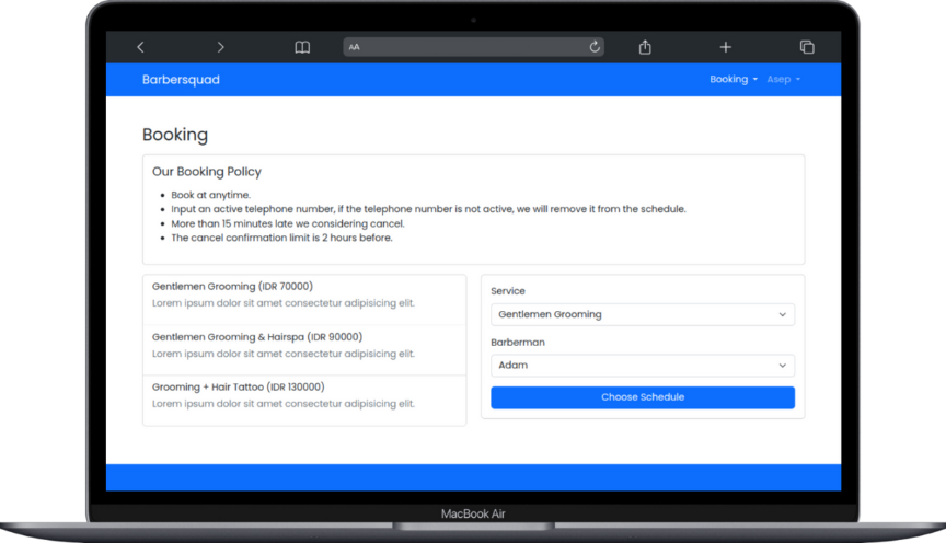 Barbershop Booking System yang dikembangkan untuk mempermudah pelanggan dalam melakukan reservasi online, mulai dari pemilihan jadwal yang tersedia hingga konfirmasi janji temu secara praktis.